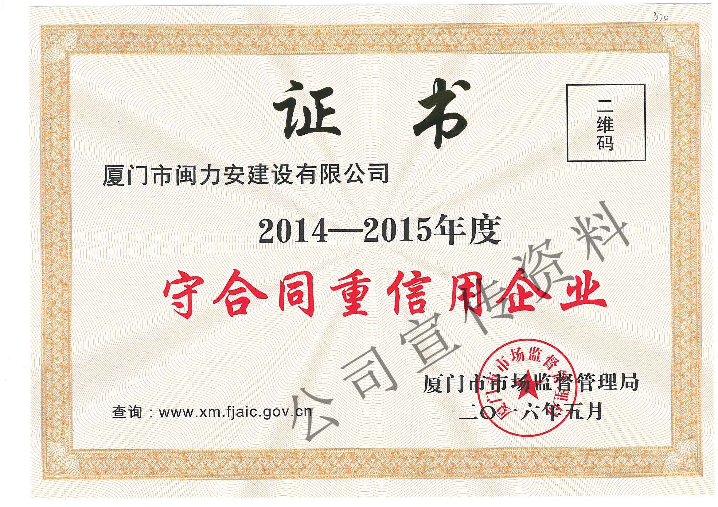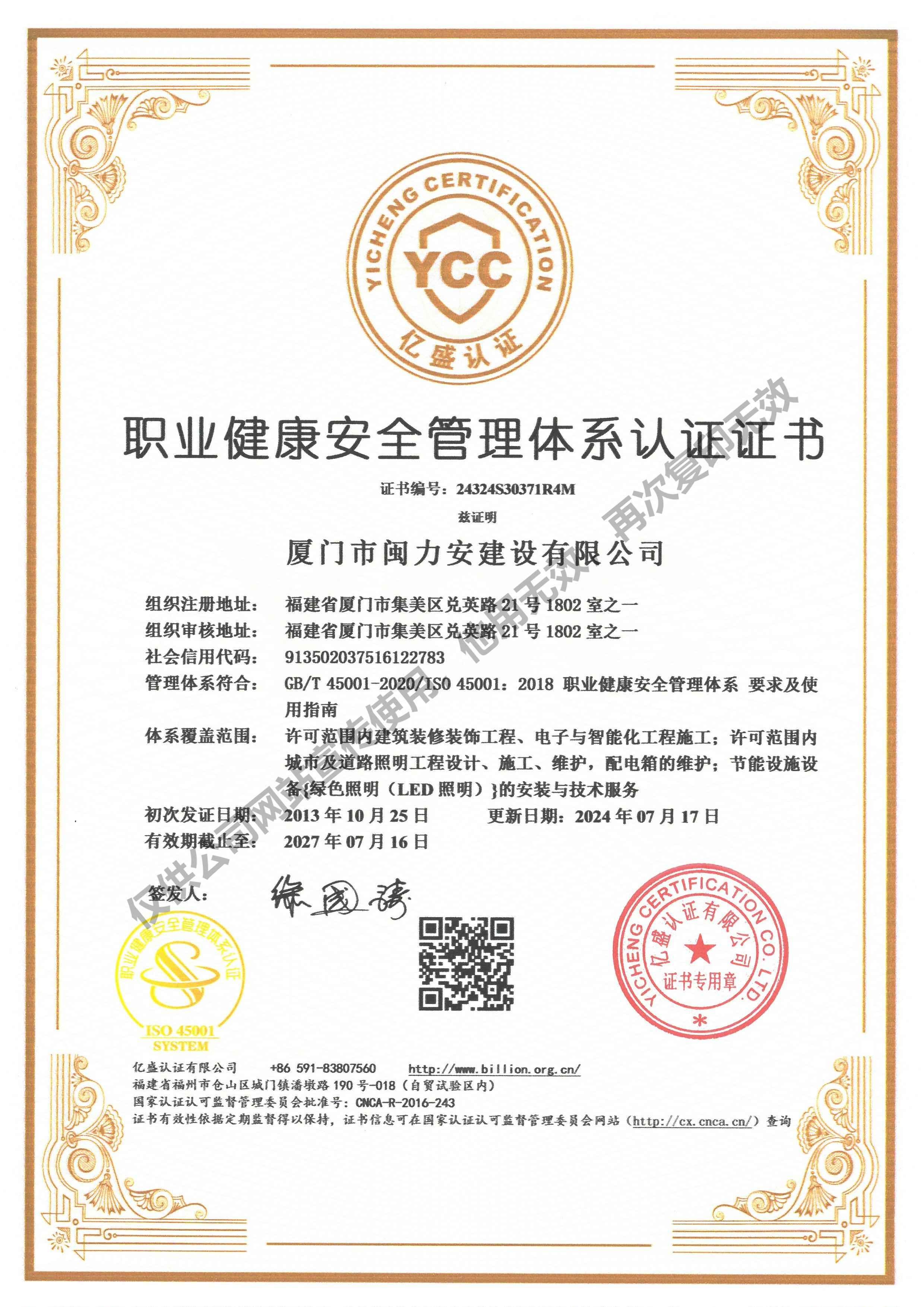 廈門市閩力安建設(shè)有限公司成立于2003年,公司取得市政公用工程施工總承包貳級、建筑裝修裝飾工程專業(yè)承包壹級、城市及道路照明工程專業(yè)承包壹級、電子與智能化工程專業(yè)承包貳級、消防設(shè)施工程專業(yè)承包貳級、電力工程施工總承包叁級、建筑機(jī)電安裝工程專業(yè)承包叁級、輸變電工程專業(yè)承包叁級、環(huán)保工程專業(yè)承包叁級、照明工程設(shè)計專項(xiàng)甲級、建筑裝飾工程設(shè)計乙級、施工勞務(wù)等資質(zhì)的綜合型企業(yè),公司于2013年通過了ISO9001質(zhì)量體系認(rèn)證,ISO14001環(huán)境管理體系認(rèn)證,OHSAS18001職業(yè)健康安全管理體系認(rèn)證。